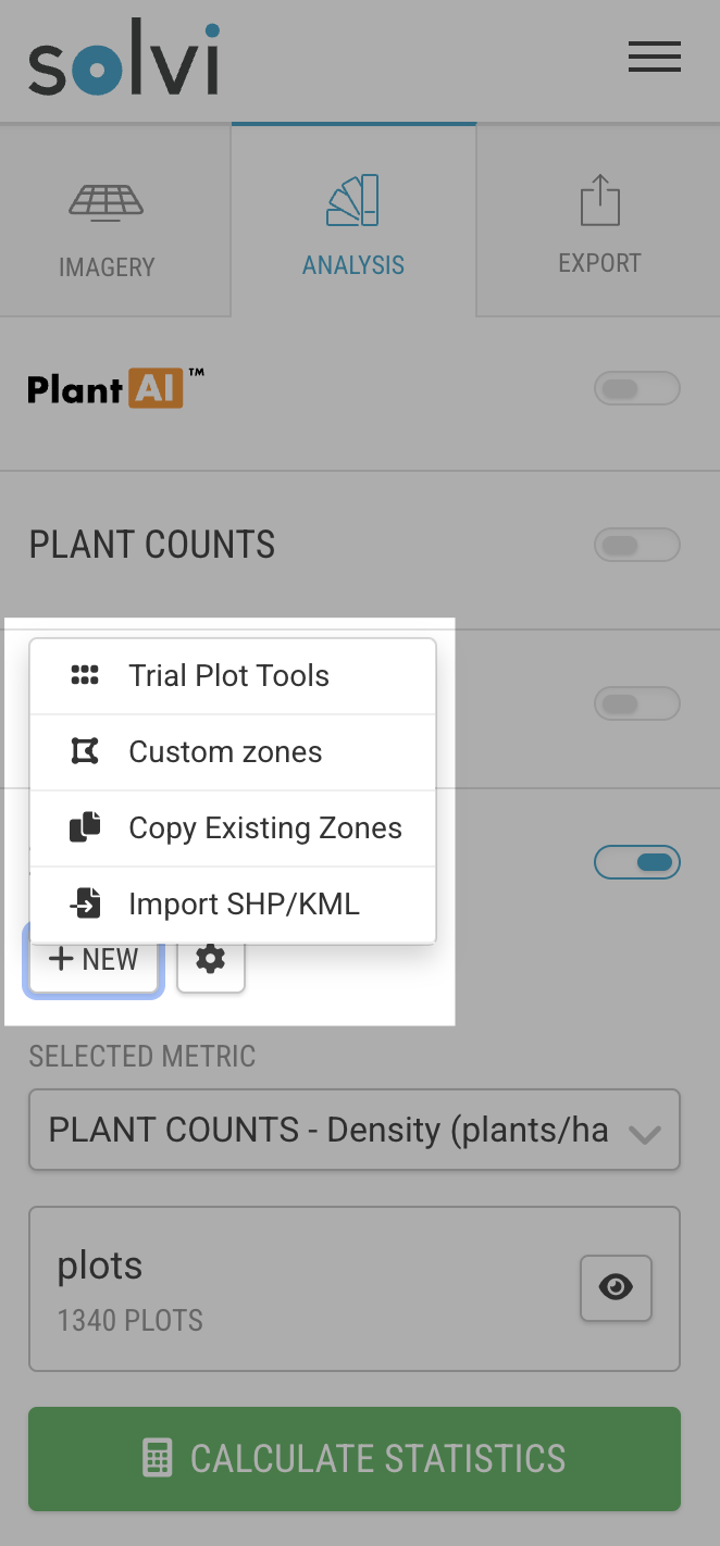 Before you can calculate metrics, you first need to define zones — the areas or plots over which statistics will be measured. In Solvi, zones are polygon boundaries that represent distinct experimental plots, management zones, or other areas of interest within an Upload or Field.