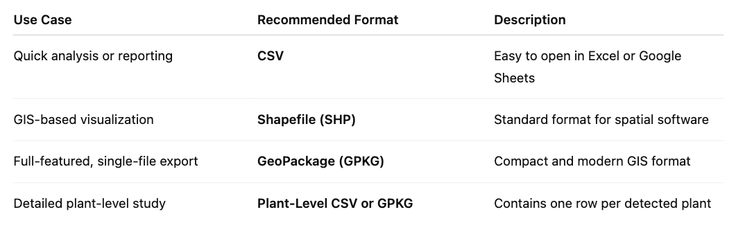 - CSV – exports a table where each row represents an individual detected plant. Includes X/Y coordinates, metric values, and the corresponding Zone ID or Plot ID for each plant.