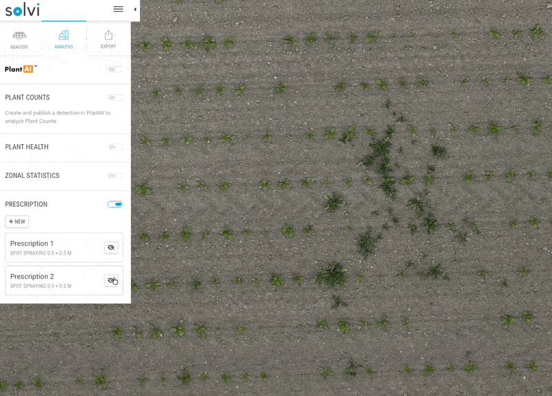 By using PlantAI weed detection results, Solvi can automatically identify patches of weeds and create a prescription map that distinguishes between spray and no-spray zones.
