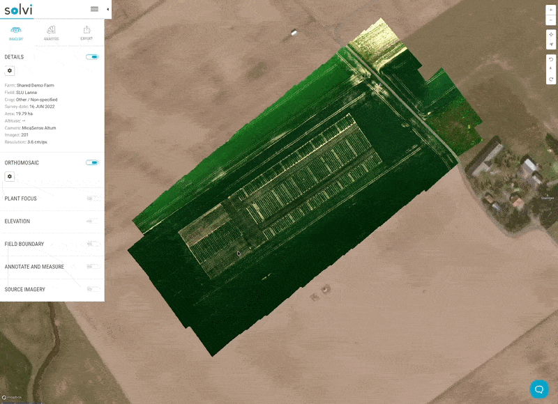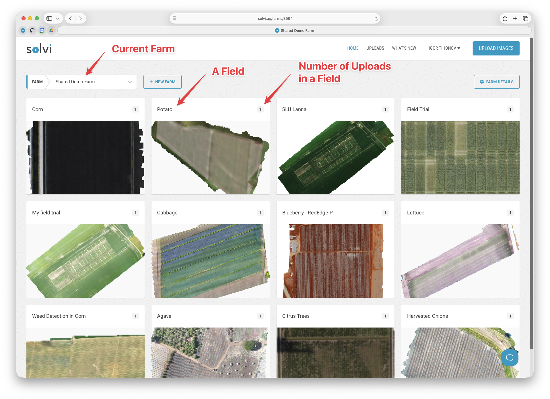 Fields are the second level of organization in Solvi. Each Farm can contain multiple Fields, and each Field can hold multiple Uploads. Fields group together imagery collected at the same location over time, making it possible to compare results across multiple flights.