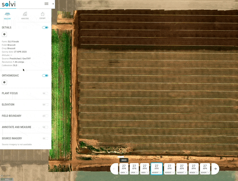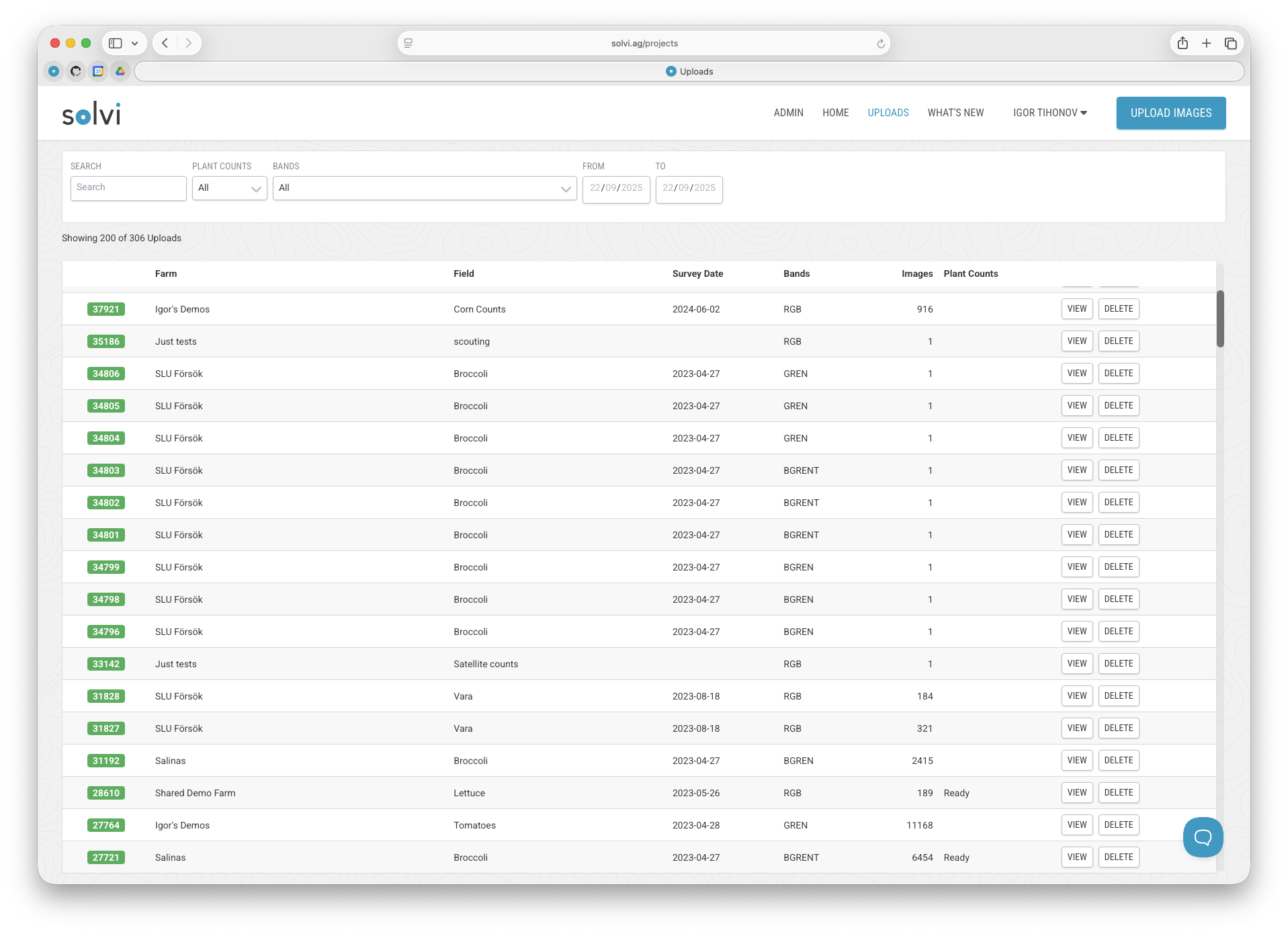 Uploads are the lowest level of organization in Solvi. Each Upload represents a single dataset of drone imagery, typically collected during one or several consecutive flights over a field. Uploads are always linked to a Field, making it easy to keep multiple datasets for the same location grouped together.