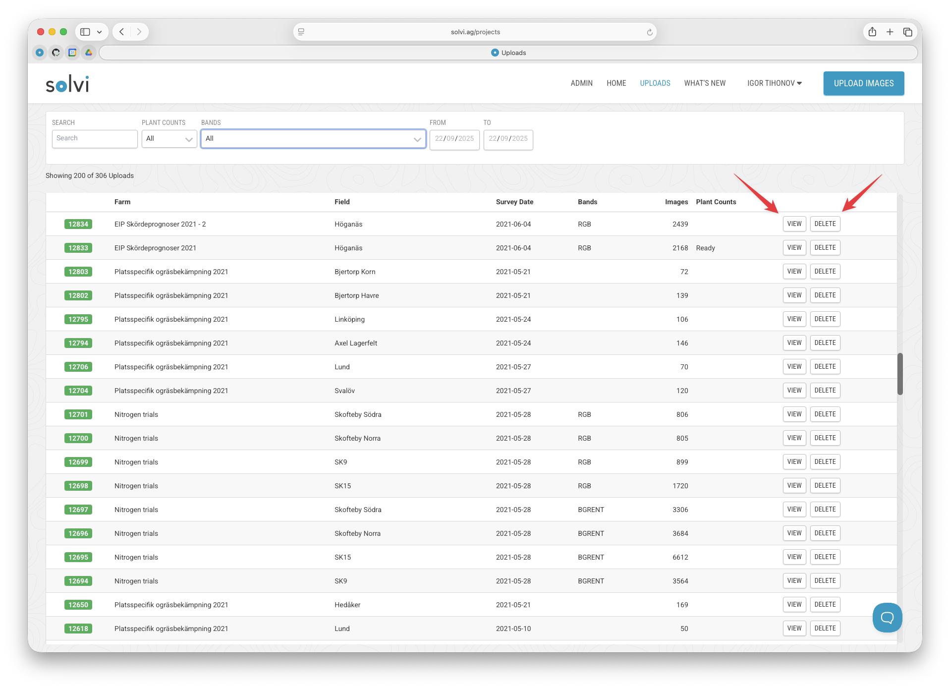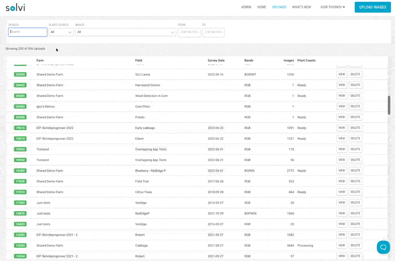 To see an overview of all Uploads across your account, open the Uploads page from the top menu. This page lists every Upload from all Farms and Fields in user's account. It provides a centralized view of your datasets, making it easy to find and manage them.